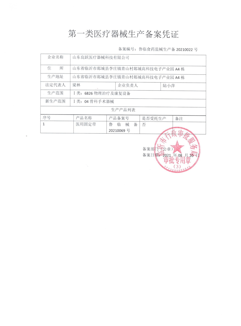 第一类医疗器械生产备案凭证