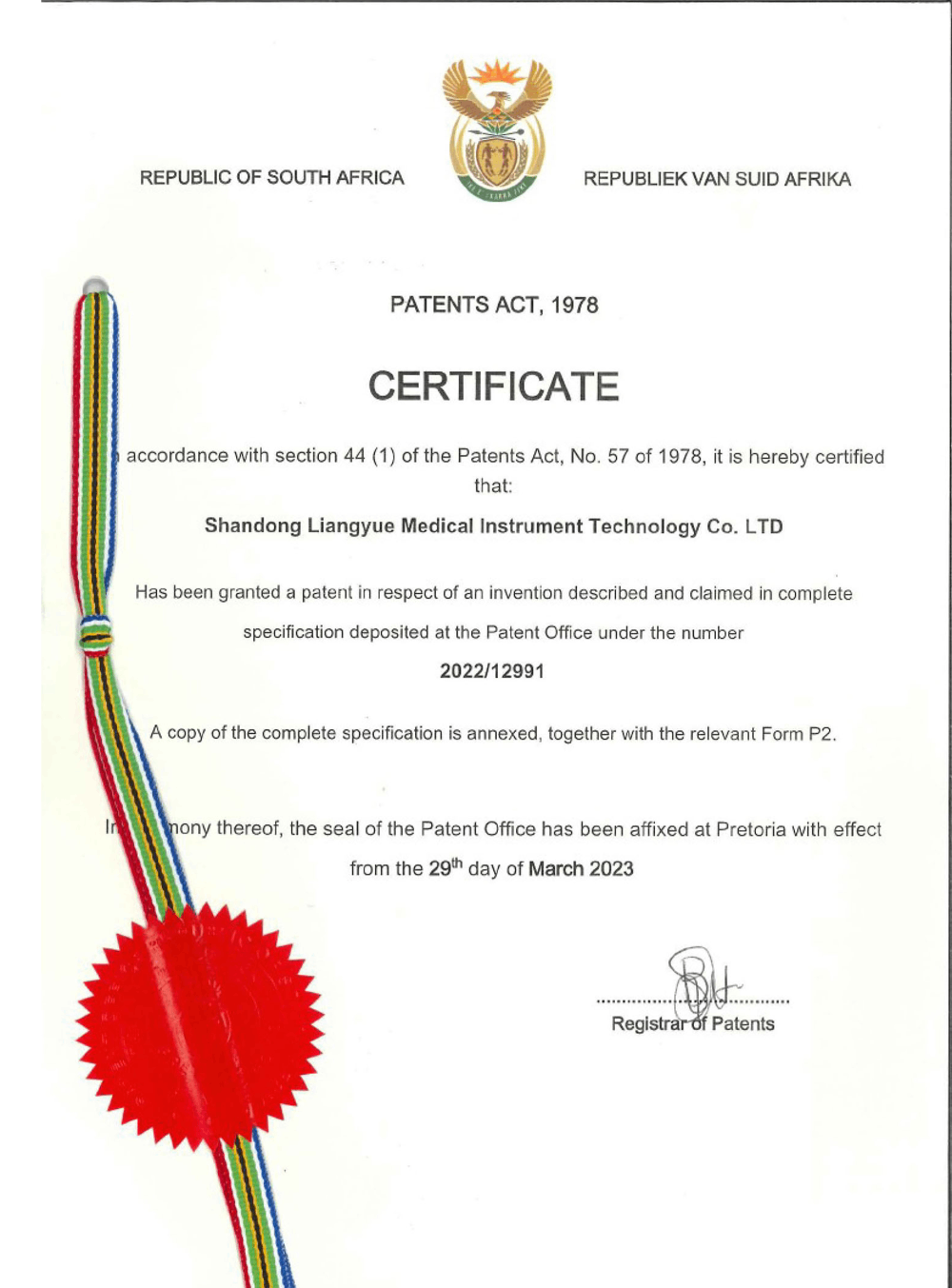 南非专利证书